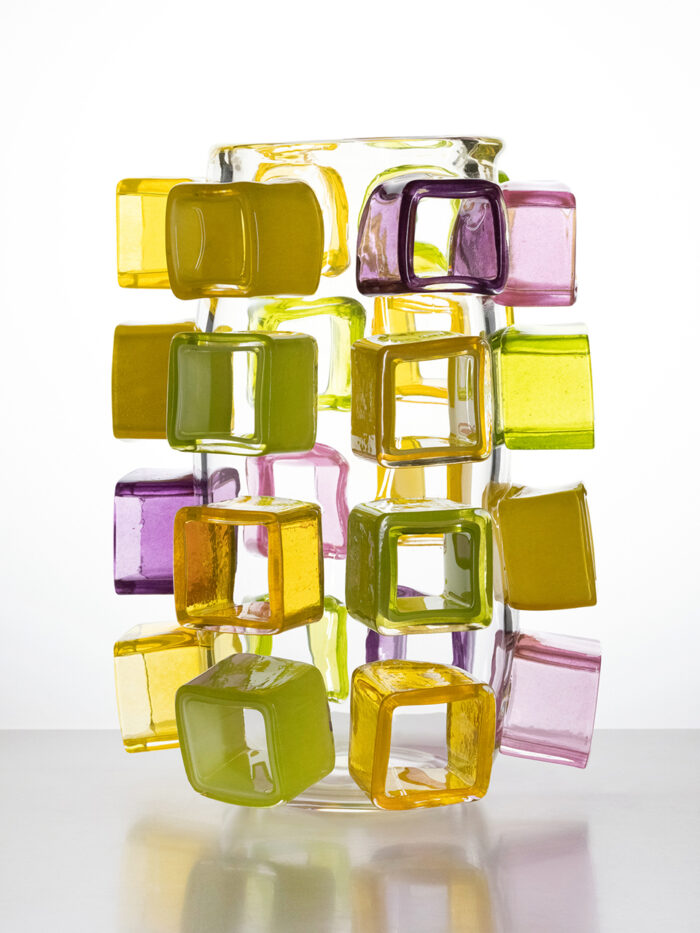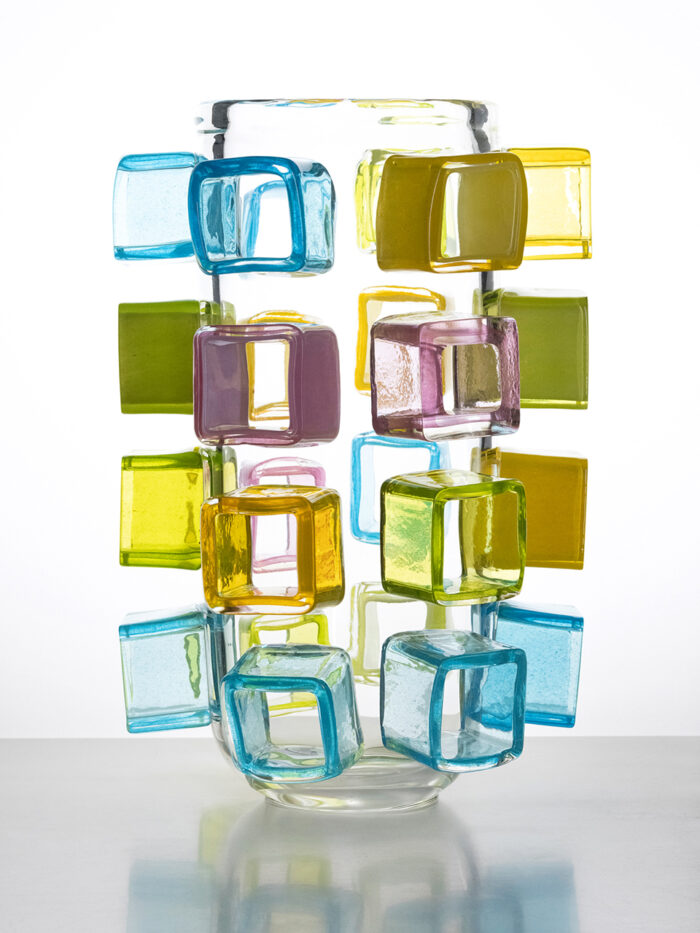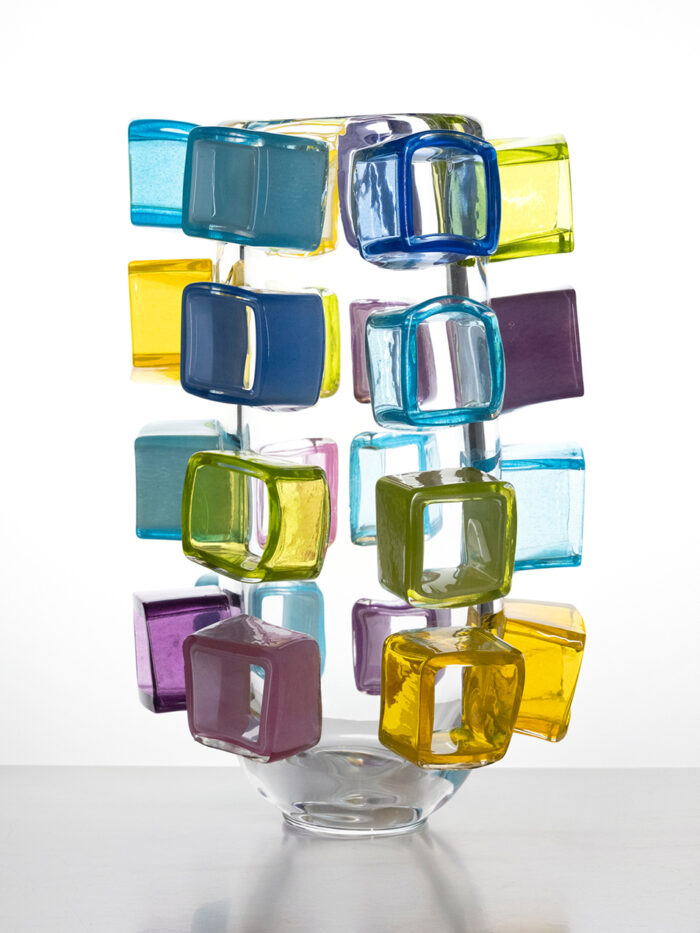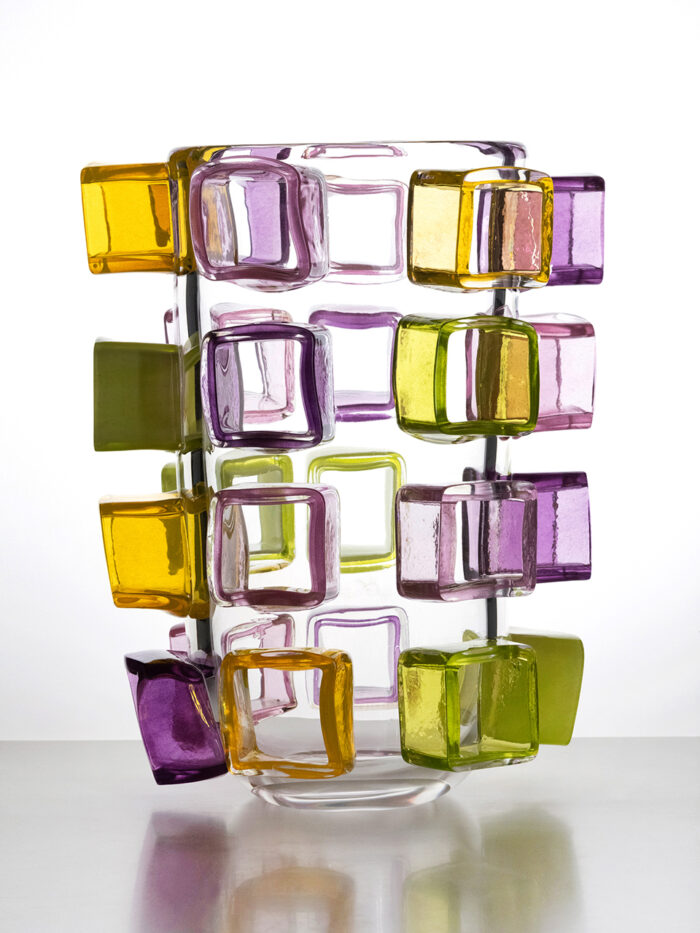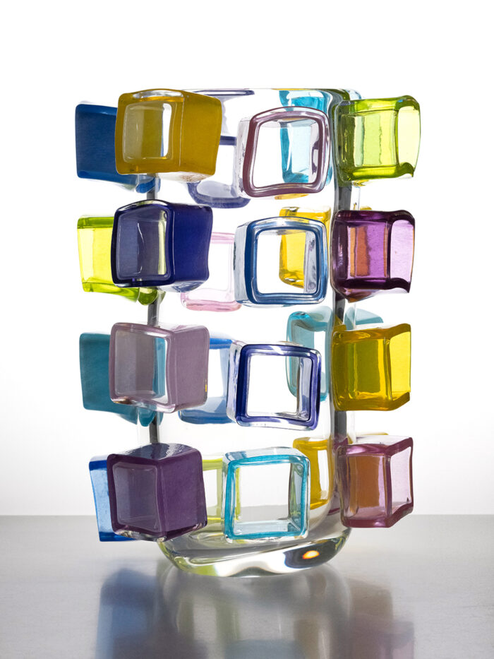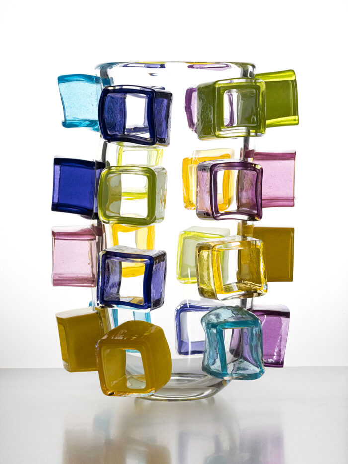 2205.05 A medium sized vase, stacking technique, four rings of coloured glass. Height 19cm/7.5”. Made in the Workshop of Glashütte Gernheim. Glasmaster Korbinian Stöckle & team. Executed in May 2022.